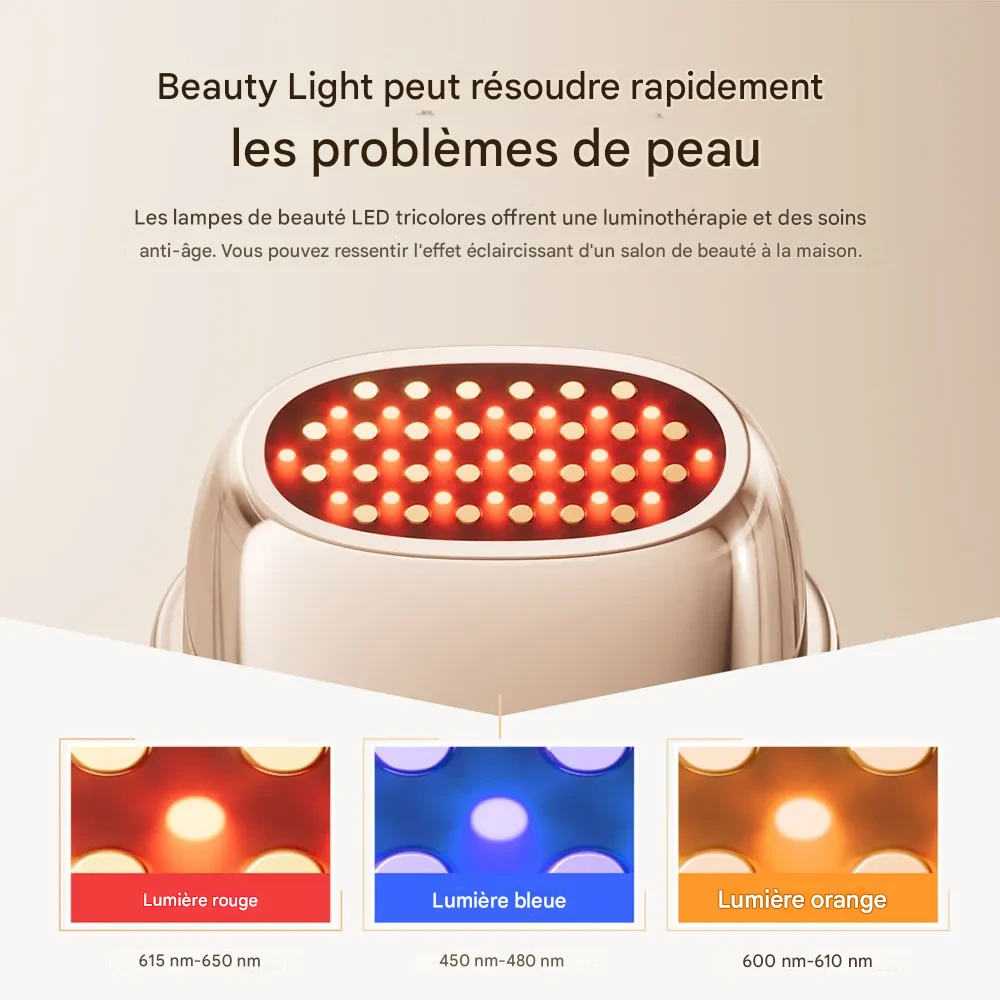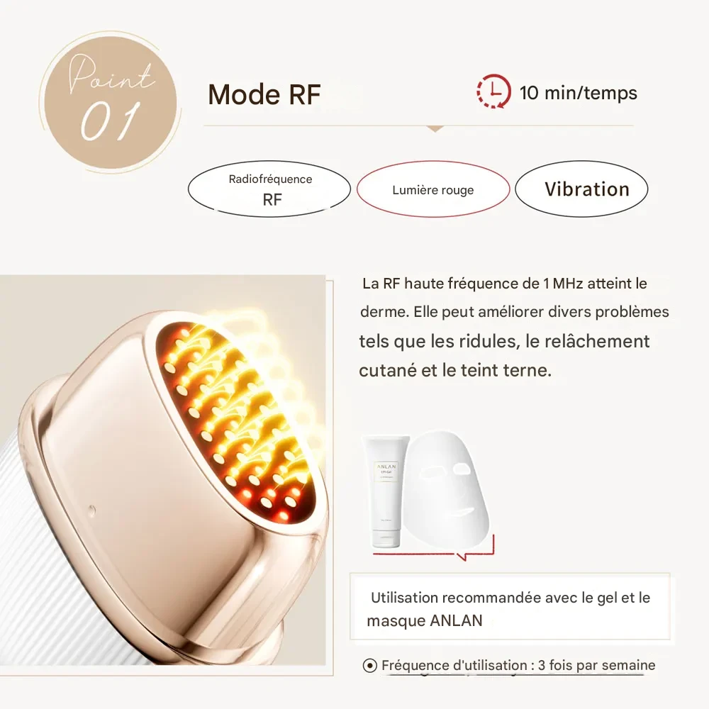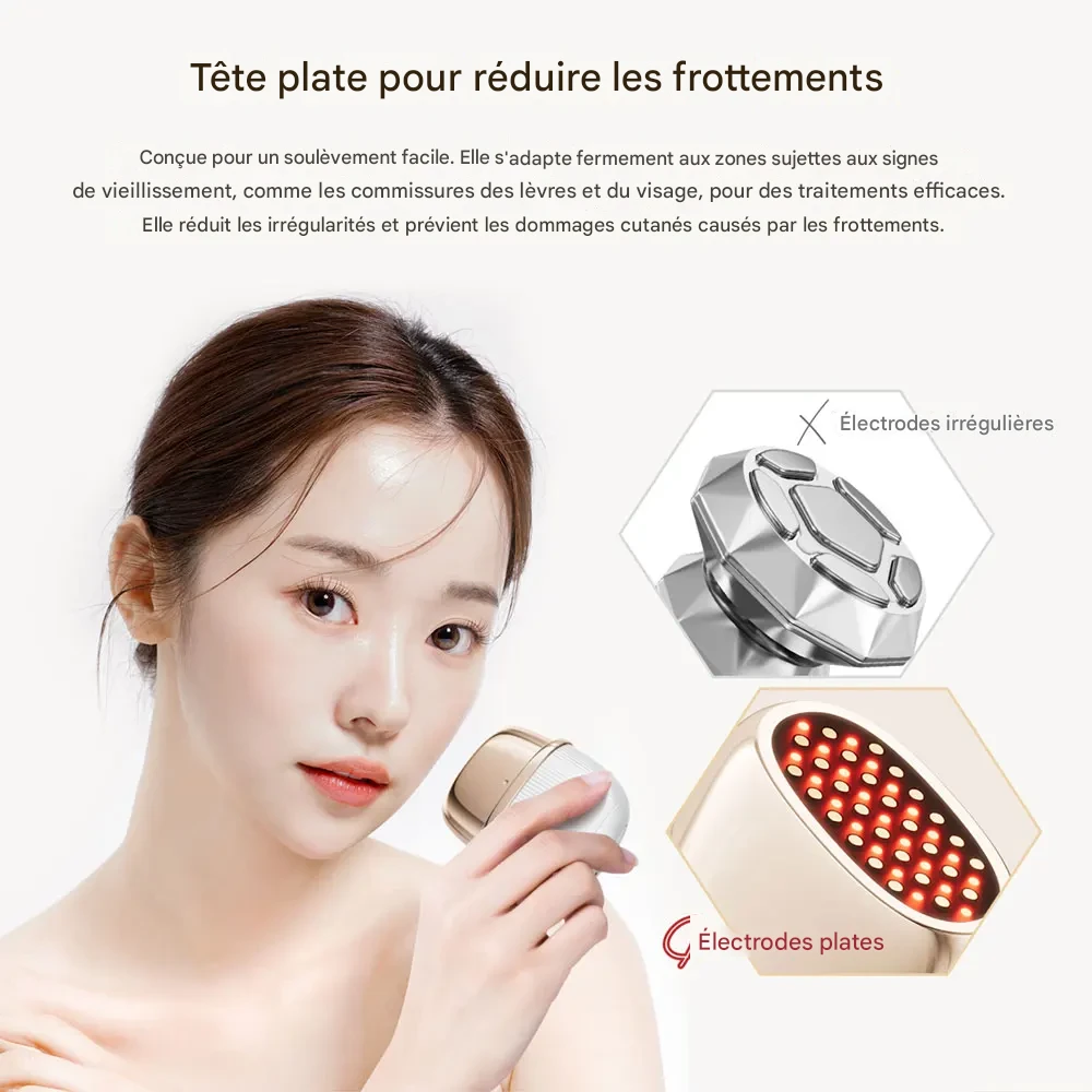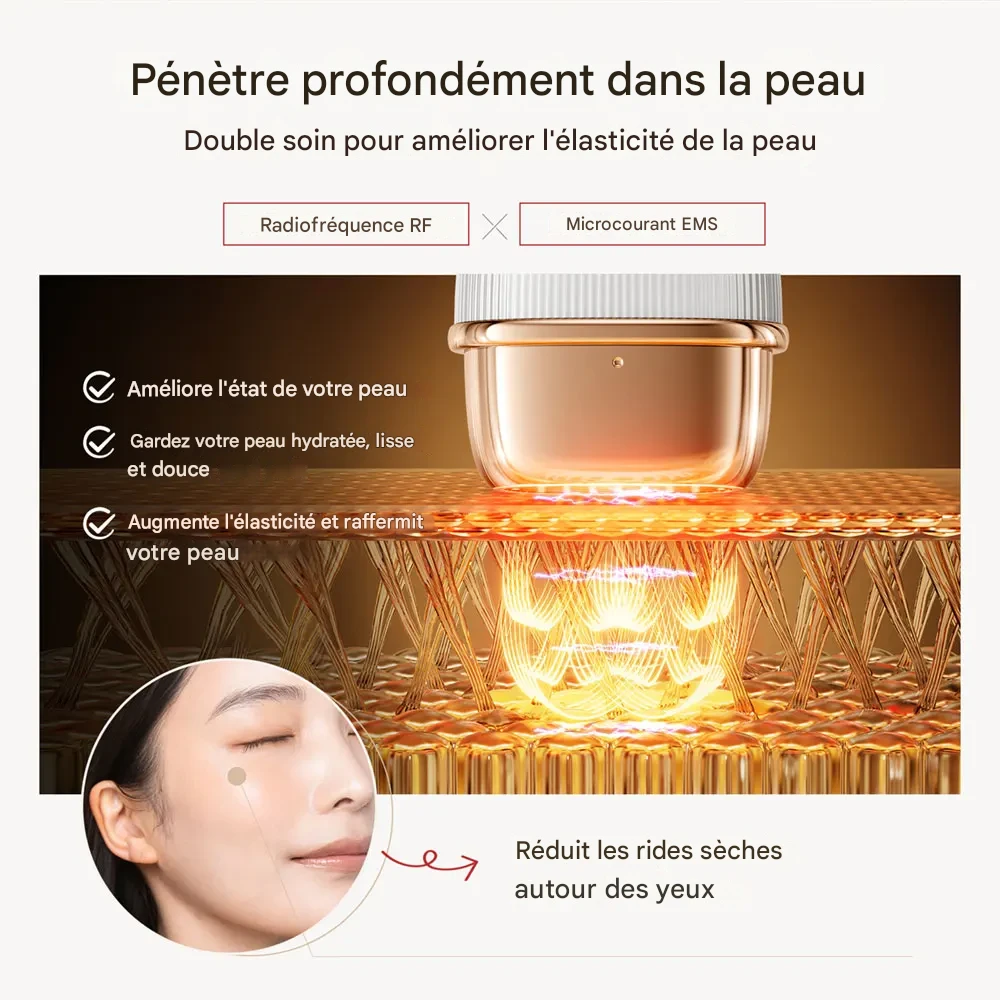 Appareil de beauté multifonction combinant radiofréquence, EMS et lumière tricolore pour raffermir la peau, lifter le visage, réduire les rides et revitaliser grâce à un massage au 24K or.