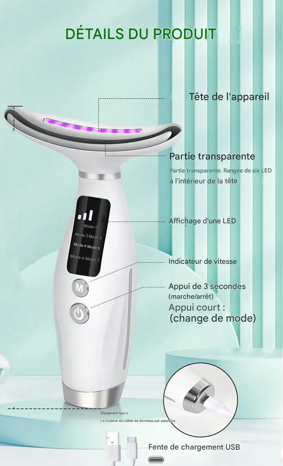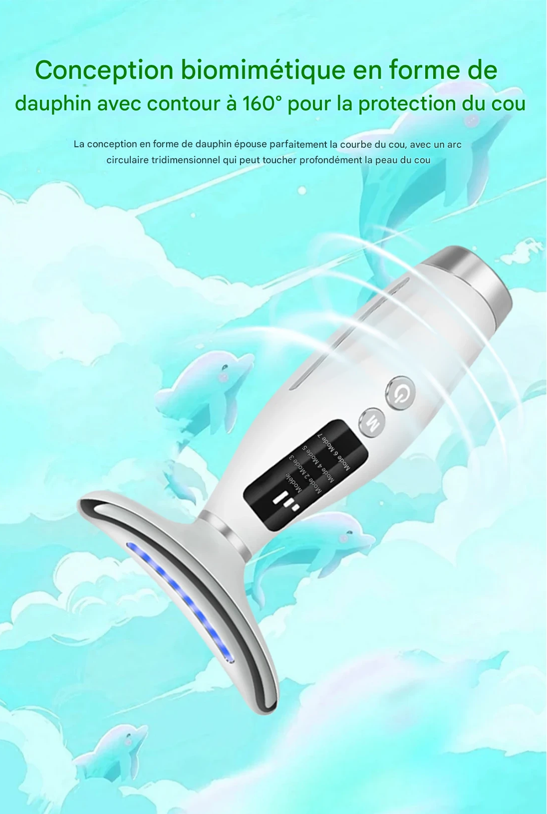 Appareil de beauté visage et cou avec 7 modes de lumière couleur et 7 vitesses réglables, équipé d’une poignée incurvée pour un soin précis et confortable.