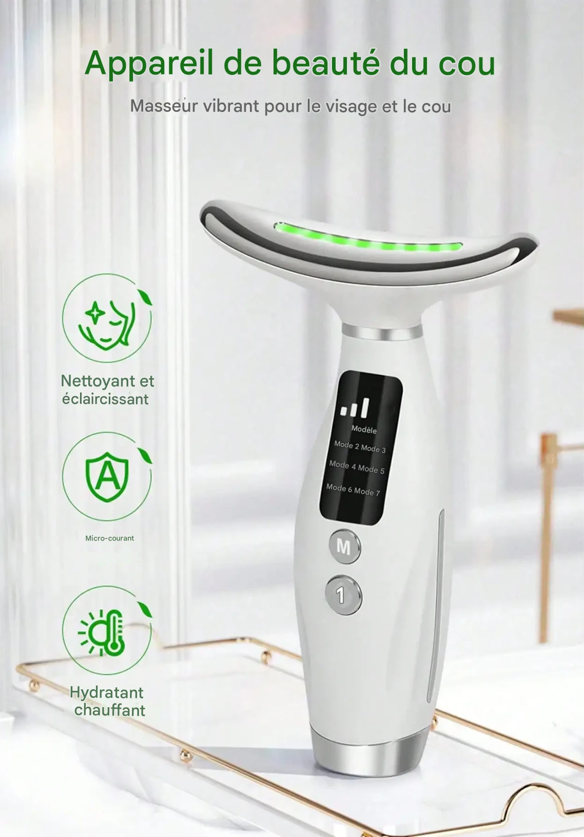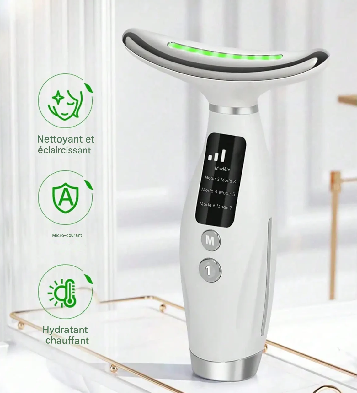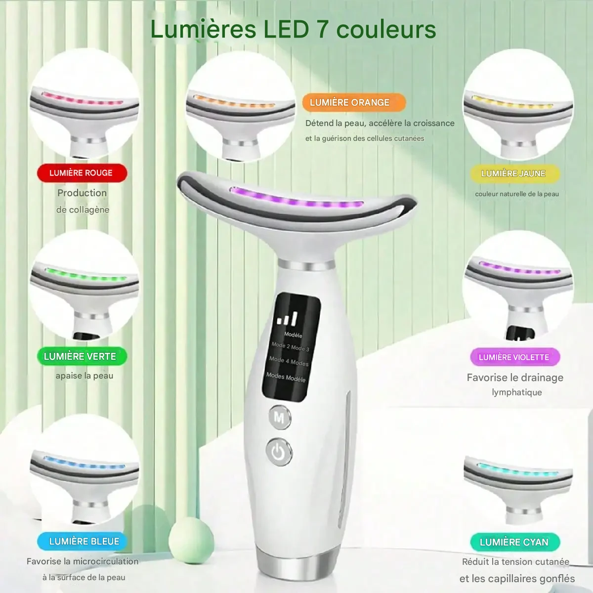 Appareil Visage & Cou Lumière LED 7 Modes, Poignée Ergonomique