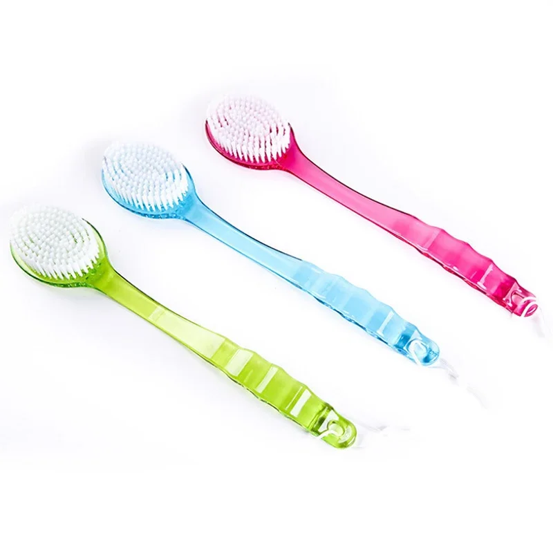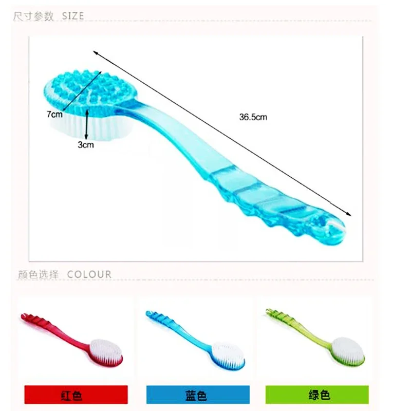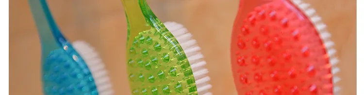 Brosse de bain à long manche pour exfoliation et massage de la peau, adaptée pour un nettoyage en profondeur du dos avec choix de couleurs bleu, vert ou rouge.