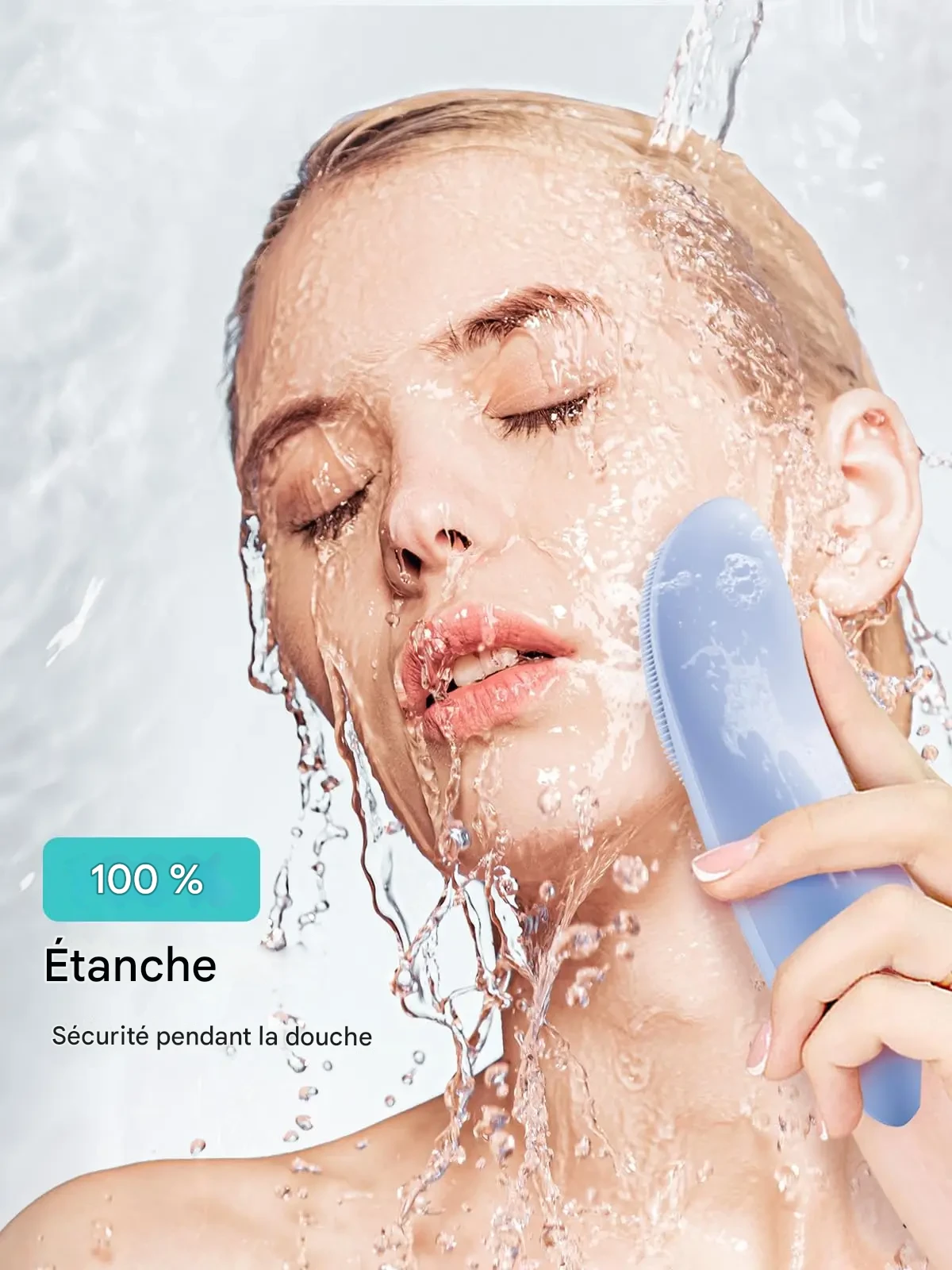 Brosse nettoyante visage étanche rechargeable offrant un nettoyage en profondeur, exfoliation douce et massage avec protection des yeux pour une peau nette et revitalisée.