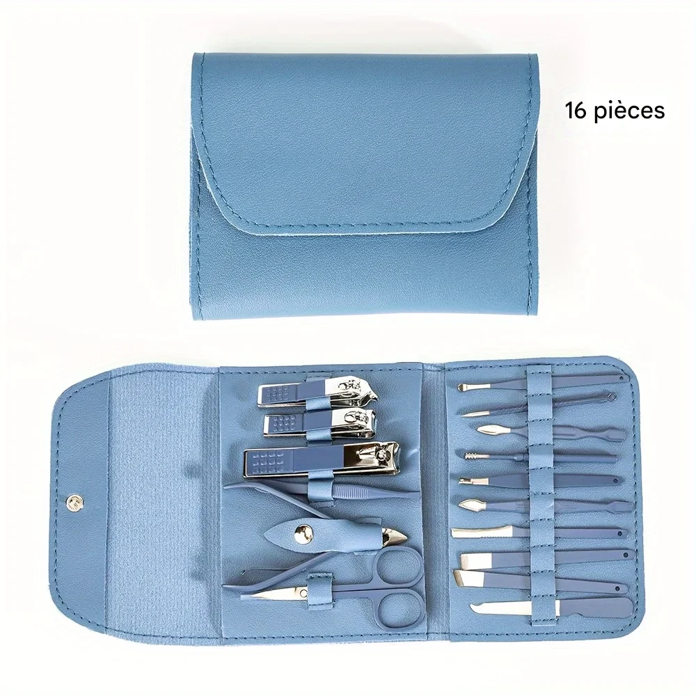 Set professionnel de 16 pièces comprenant coupe-ongles et pince à cuticules avec étui de voyage, disponible en plusieurs couleurs pour une manucure et pédicure précises et hygiéniques.