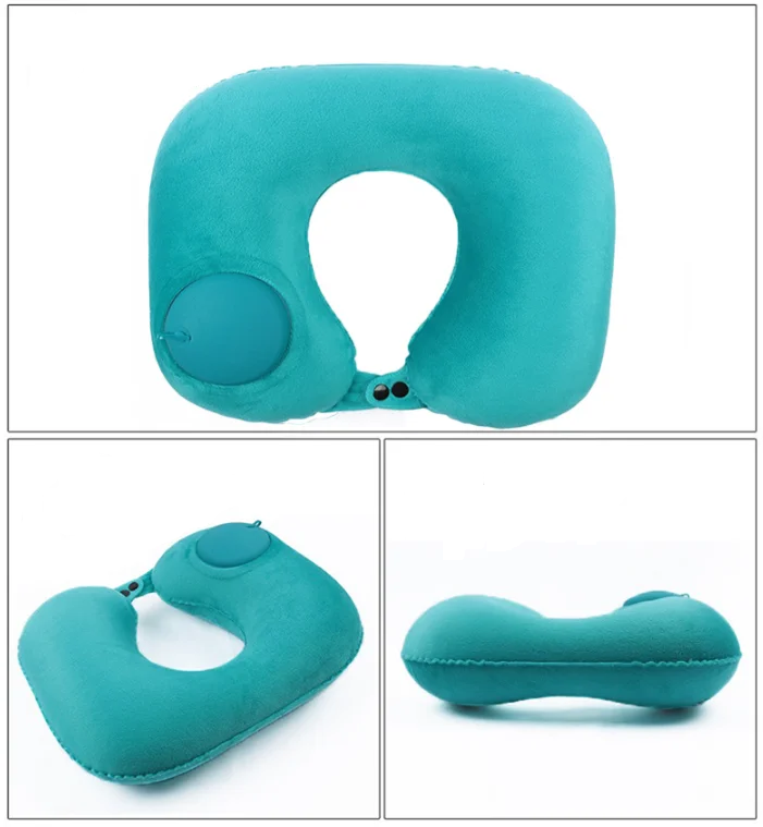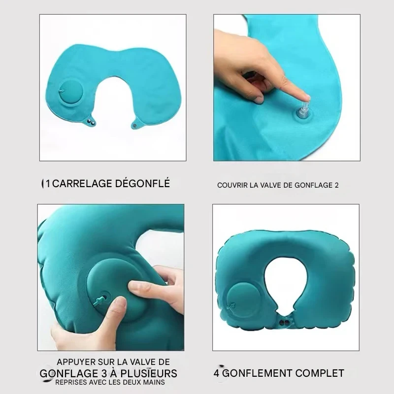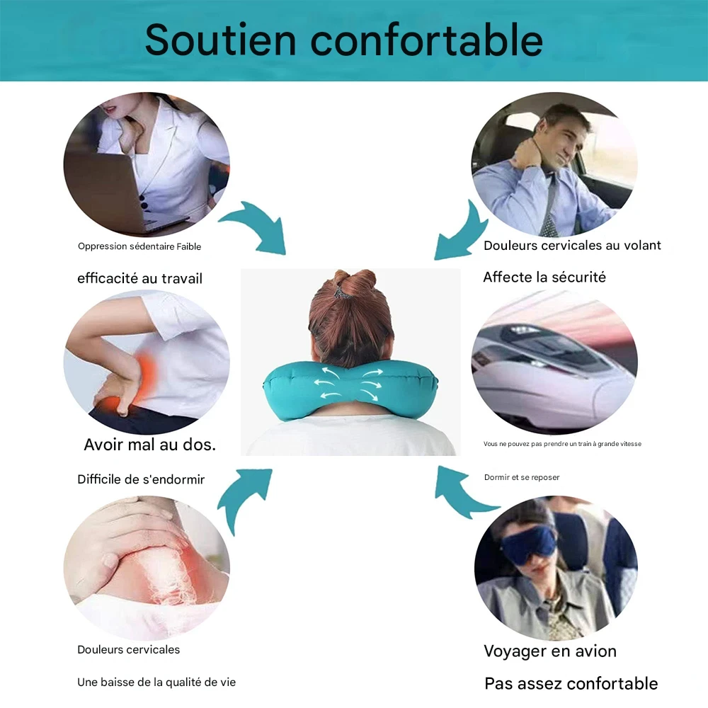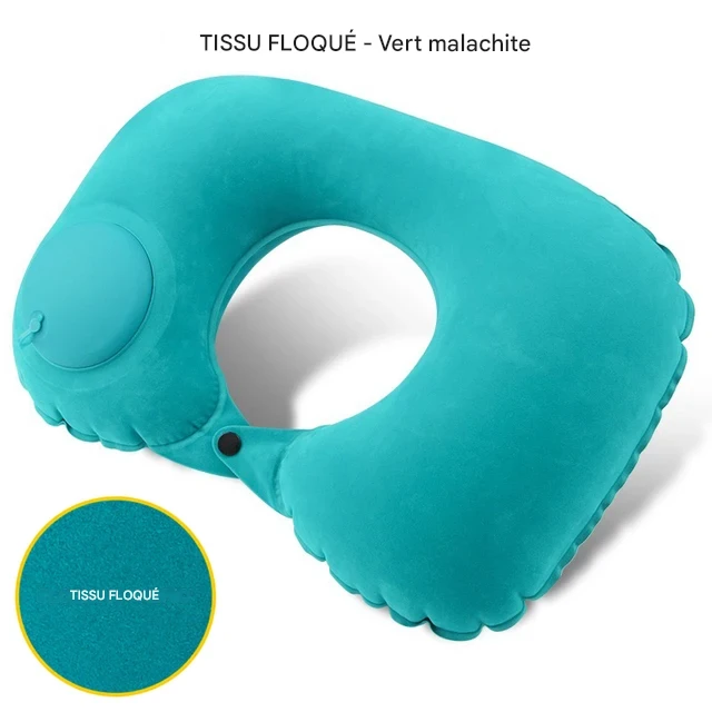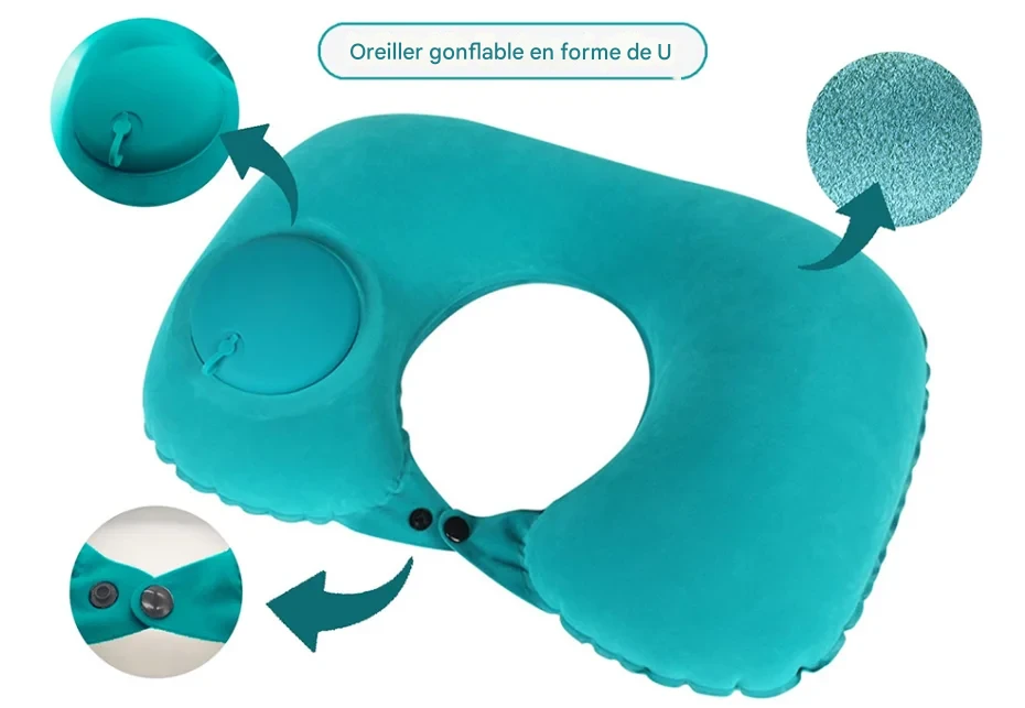 Coussin de voyage gonflable en forme de U, léger et pliable, offrant un soutien ergonomique pour le cou lors des déplacements en voiture, avion ou en plein air. Disponible en plusieurs couleurs.