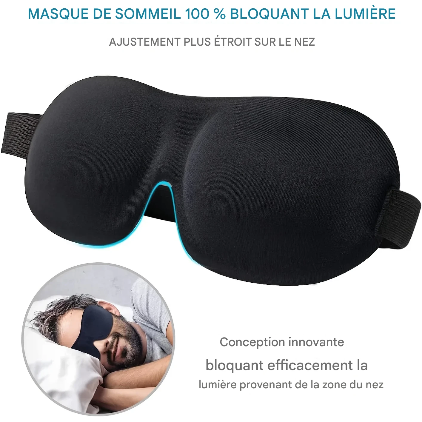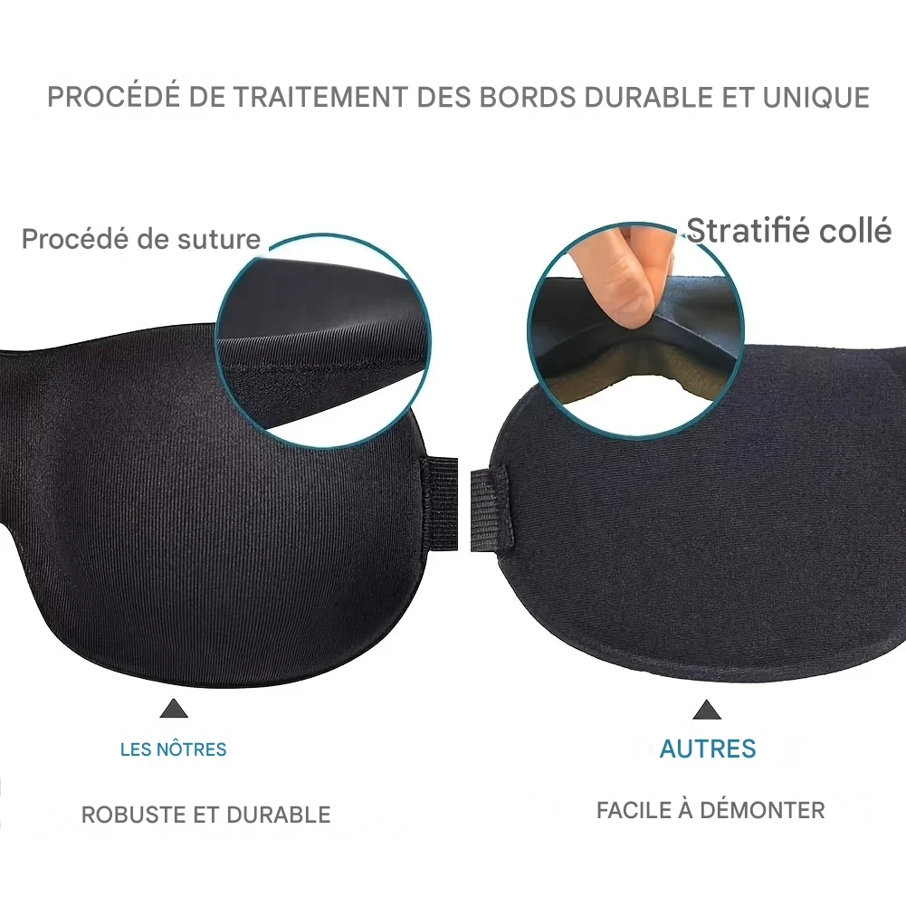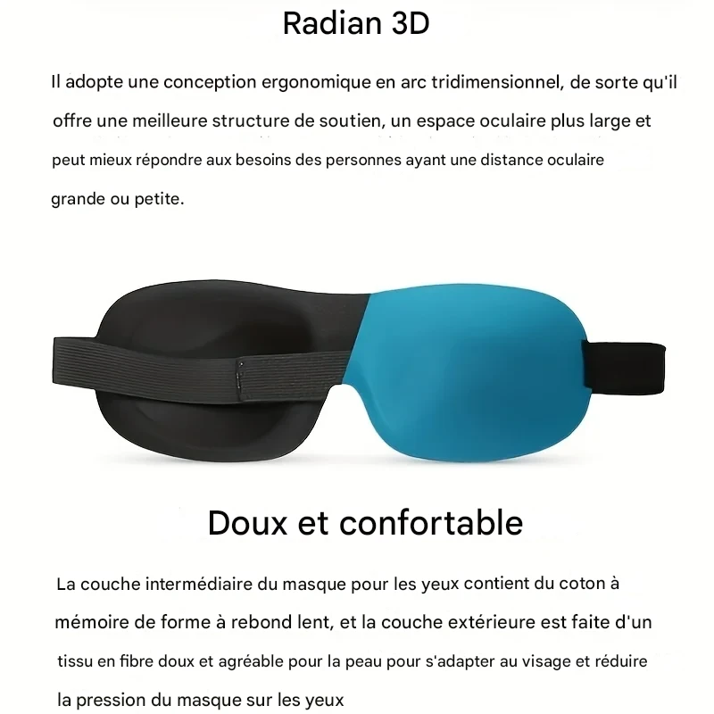 Masque de sommeil 3D profilé offrant un blocage total de la lumière, en matériau ultra-doux et respirant pour un confort optimal lors du repos, du voyage ou du yoga.