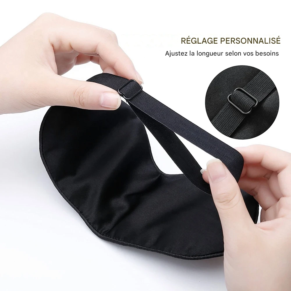 Masque de sommeil en soie naturelle ultra douce, rempli de coton, avec sangle réglable pour un confort optimal et une protection efficace contre la lumière.