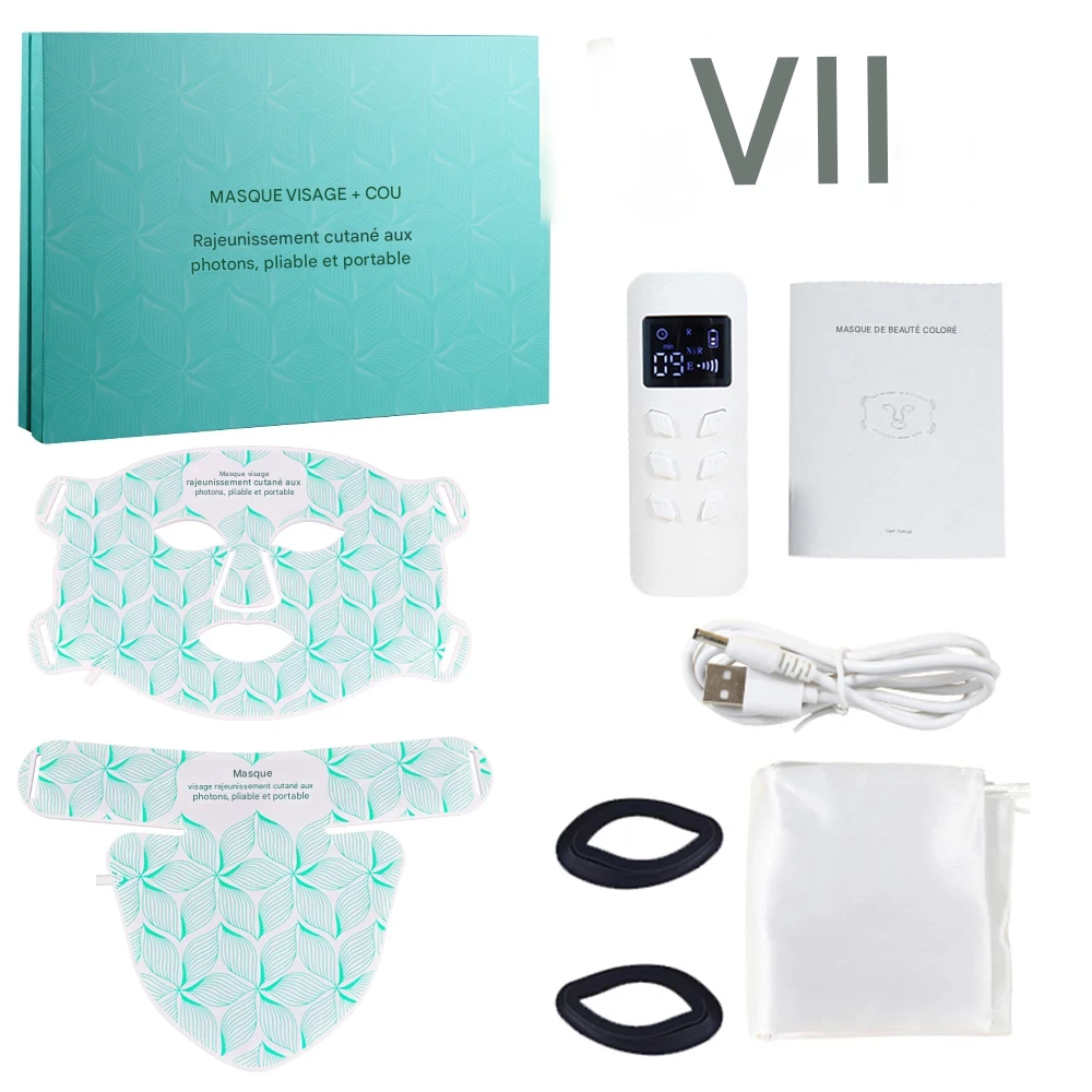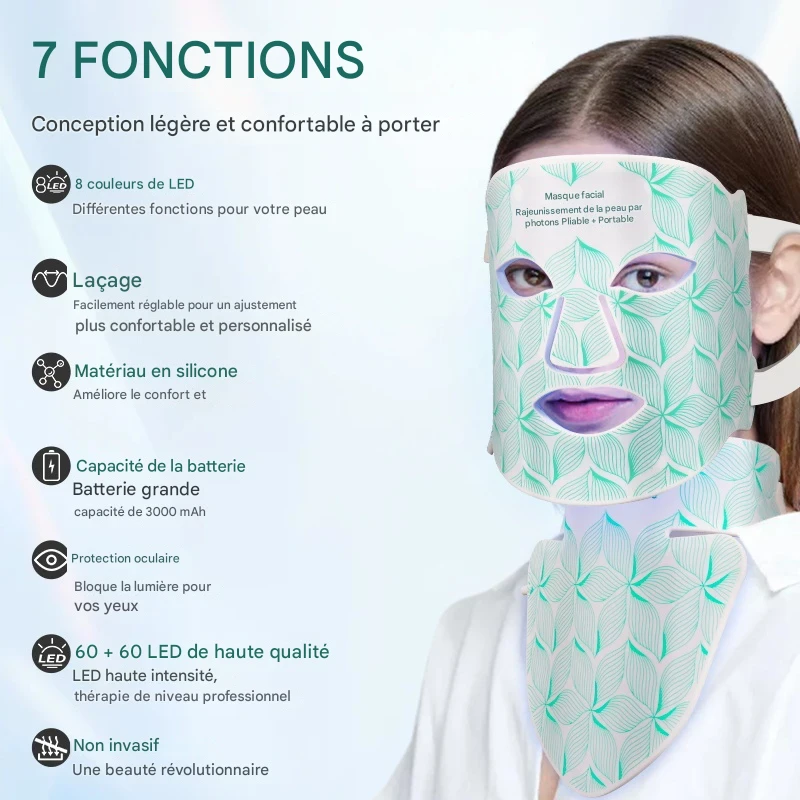 Masque LED facial avec 8 couleurs et lumière rouge proche infrarouge pour thérapie anti-âge, rajeunissement, lifting et éclaircissement de la peau incluant traitement du cou.