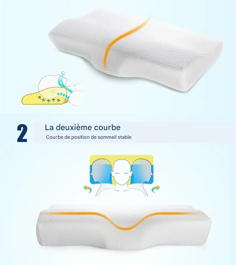 Oreiller orthopédique en mousse à mémoire de forme, conçu pour protéger la nuque avec un soutien lentement adaptable en forme de papillon, favorisant la santé cervicale.