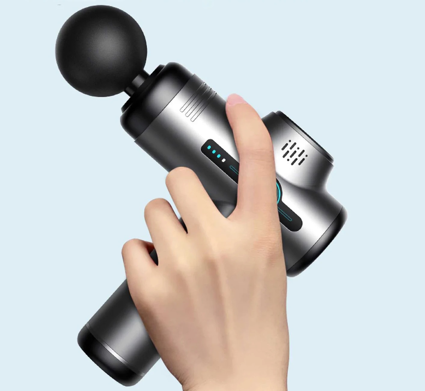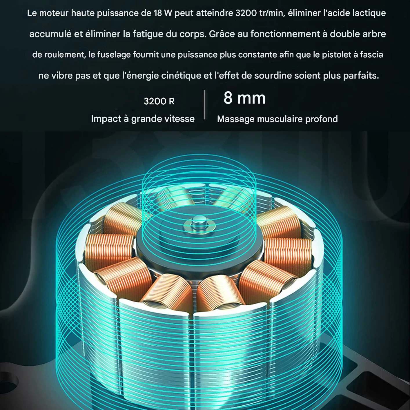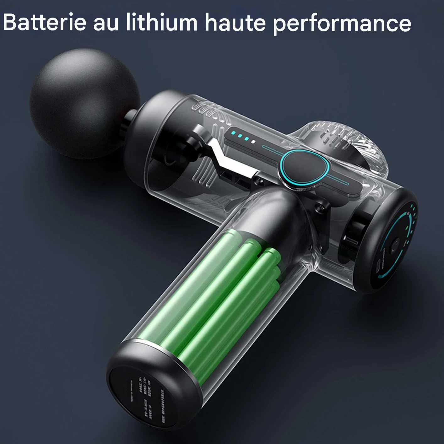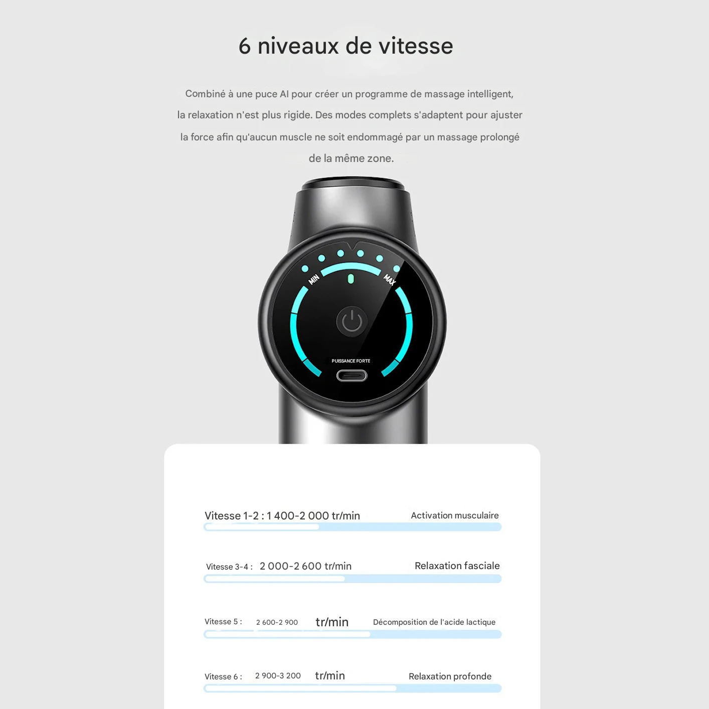 Appareil de massage profond avec six têtes amovibles et vitesses réglables pour une relaxation musculaire efficace et une récupération optimale.