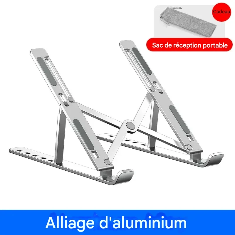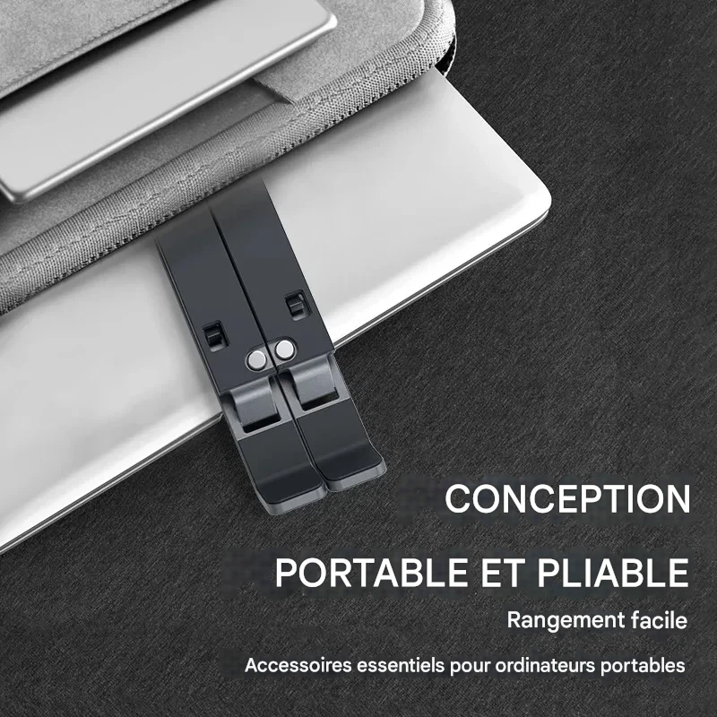 Support pliable en alliage d’aluminium, léger et solide, offrant 6 niveaux d’inclinaison pour un confort ergonomique optimal. Compatible MacBook et PC portables.