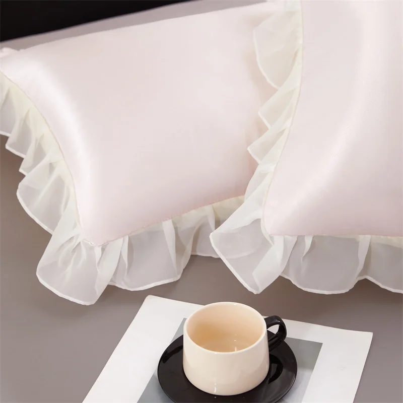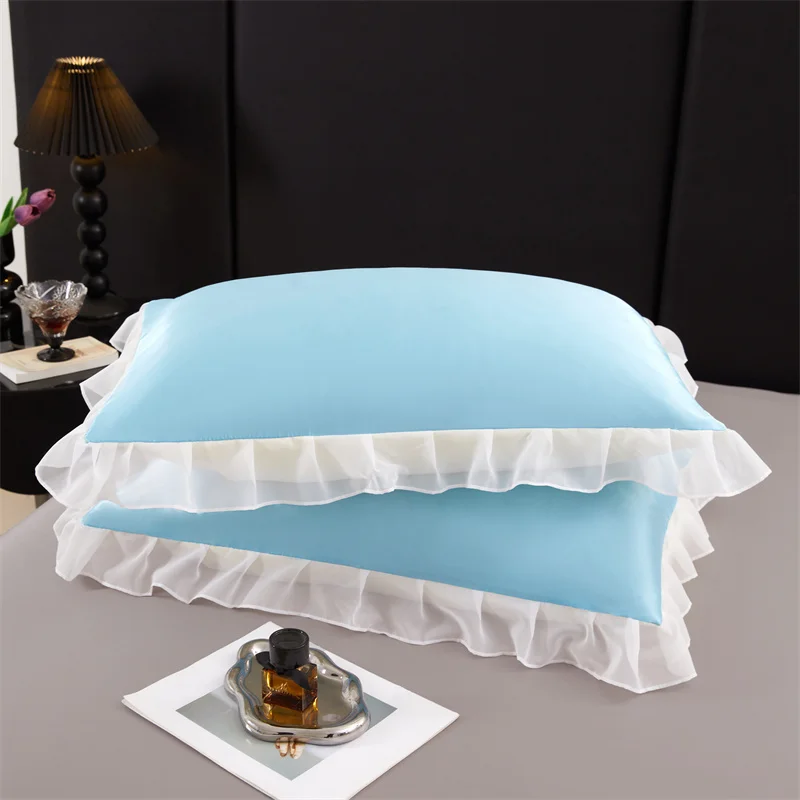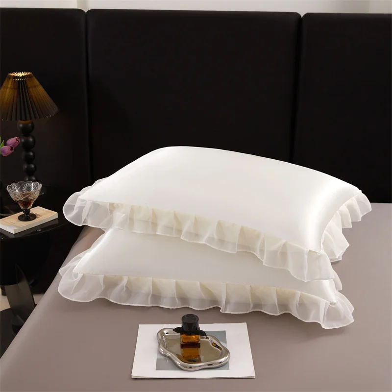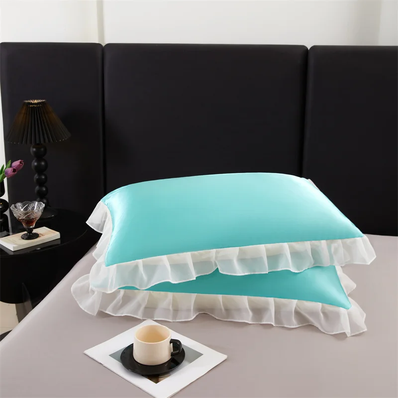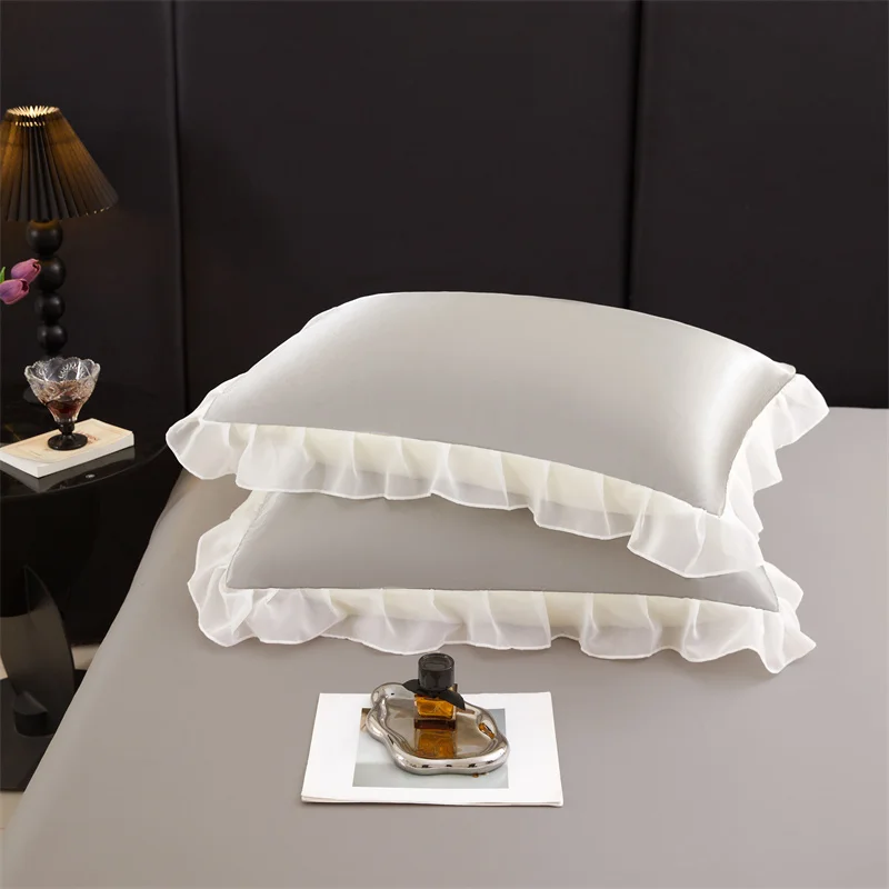 Lot de 2 taies d’oreiller en satin soyeux 48 x 74 cm avec volants, couleur unie, offrant douceur et élégance pour un confort estival optimal.