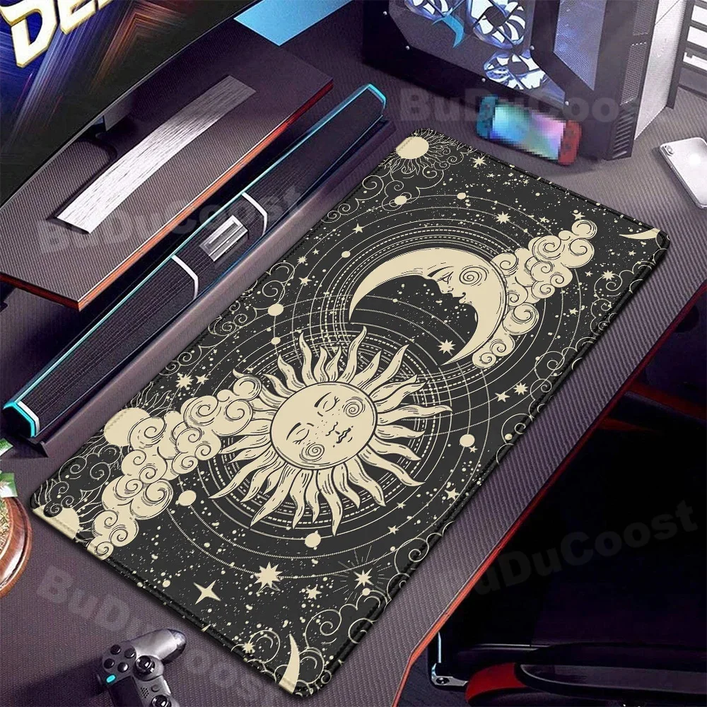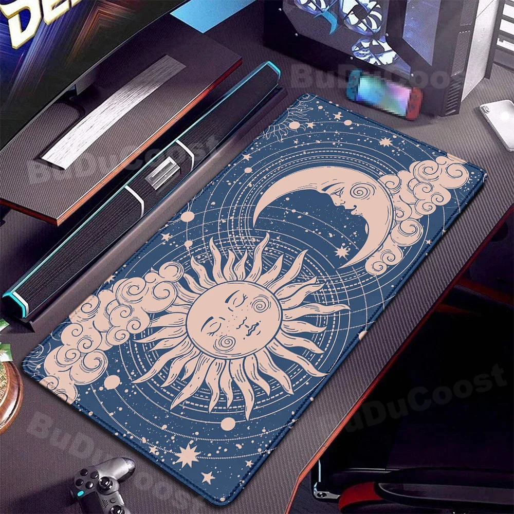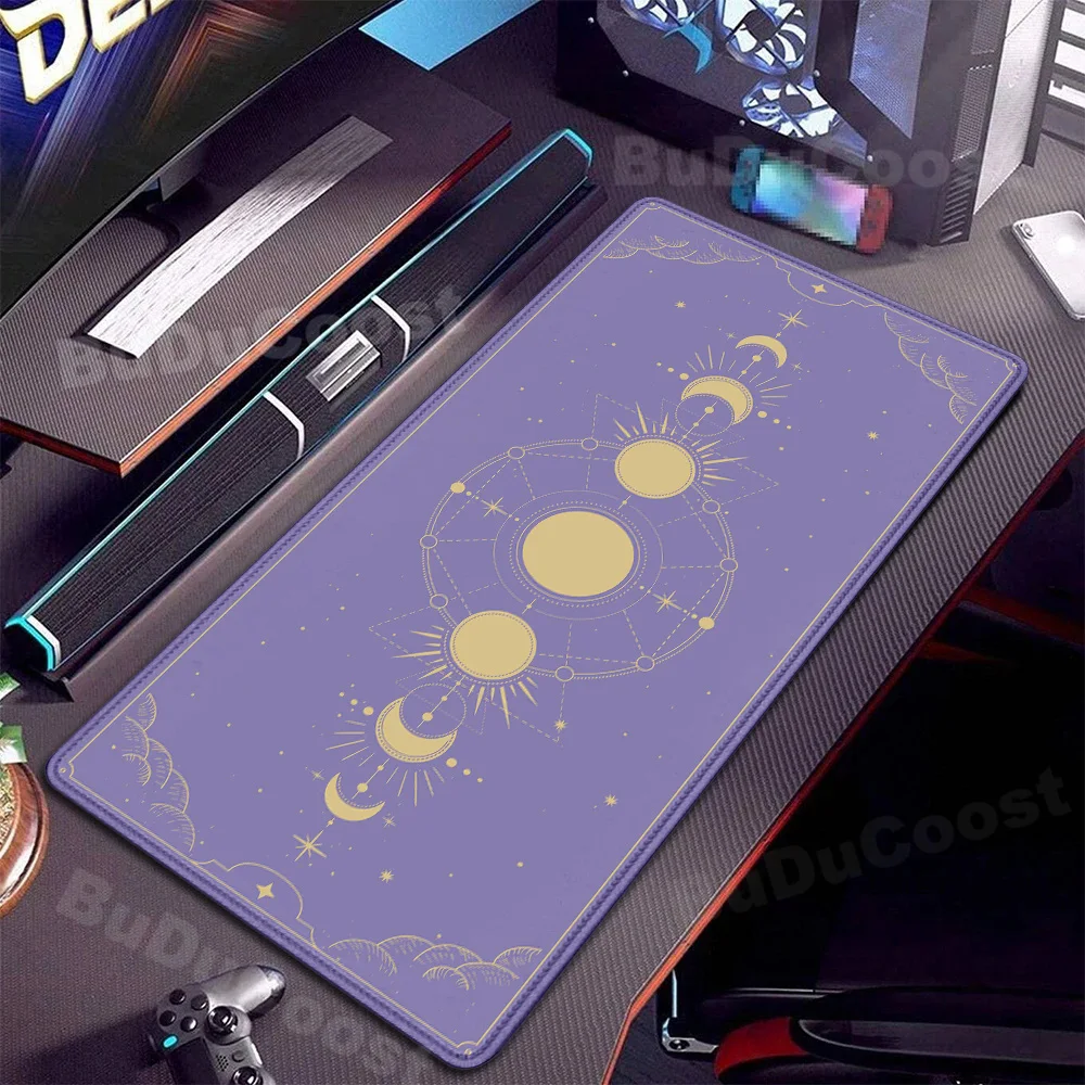Tapis de souris XXL rose avec motif lune et espace, surface lisse et caoutchouc anti-dérapant, parfait pour bureau et gaming.
